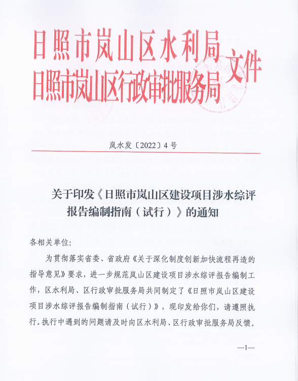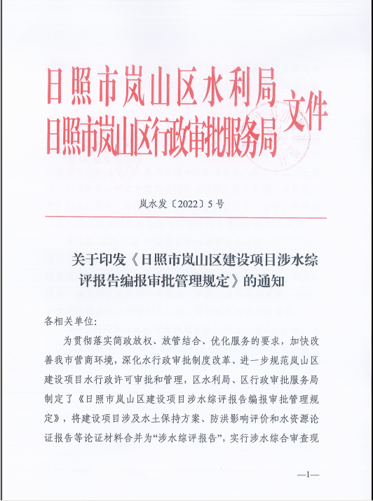 二是推行“三合一”涉水綜評報告。為優化營商環境,嵐山區水利局會同嵐山區審批局聯合印發《日照市嵐山區建設項目水影響評價編制指南(試行)》和《日照市嵐山區建設項目水影響評價報告編報審批管理規定》,在全市創新性的將涉水相關的水土保持、水資源論證、防洪影響評價“三合一”改革成“涉水綜評報告”,實行“三合一”審批后,將原有的三個評審環節合并為一個評審環節,一個項目在涉水審批上不再多次評審,將節省三分之二審批時間,既為企業減少時間成本,又為企業減少制度成本,從根本上達到為企業減負的效果。